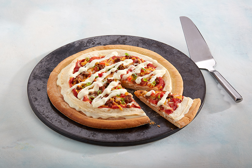 Add Muy Fresco® Queso Blanco or Monterey Jack Cheese Sauce, spreading to within 1” of the edge of the dough.